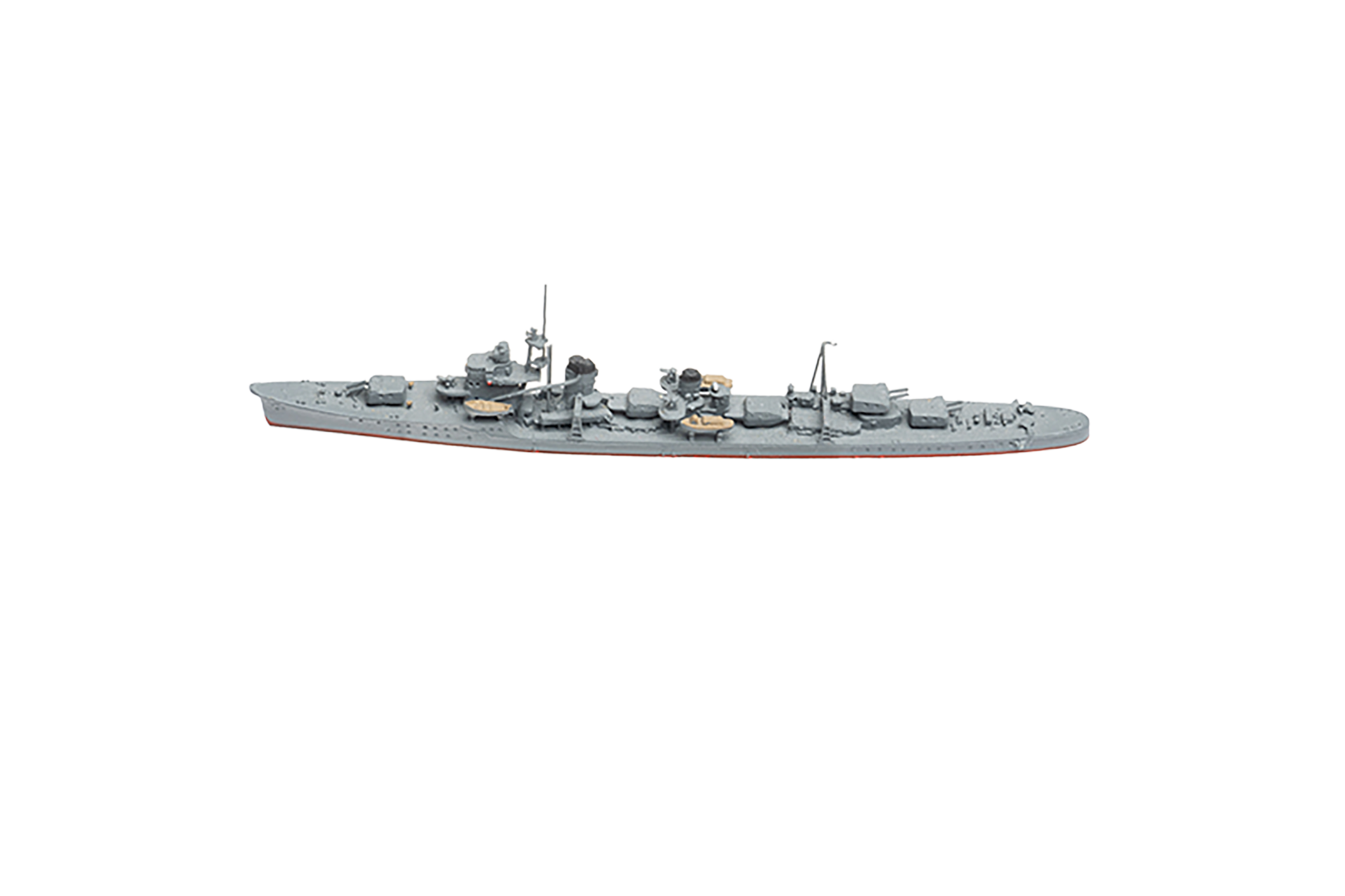 At 119.17 meters (391 feet) long and with a beam width of 10.8 meters (35 feet), Yūgumo had a standard displacement of 2,077 tons which increased to 2,520 tons when fully loaded. Her armament mirrored the Kagerō-class: Three twin turrets carried six 12.7 cm (5-inch) /50 caliber guns with two mounts forward and one mount aft in weatherproof installations which provided strong surface combat power and basic anti-aircraft defense. The ship hosted eight 61 cm (24-inch) torpedo tubes positioned in two sets of four each, deploying the Type 93 "Long Lance" torpedoes which operated on oxygen propulsion to achieve a 40,000 meters (22 miles) range at 36 knots and possessed a 490 kg (1,080 lb) warhead that exceeded Allied torpedo capabilities. The initial anti-aircraft defense system consisted of four 25 mm autocannons which expanded to 14–28 guns by 1943 to address increased air threats yet remained inadequate against concentrated attacks.